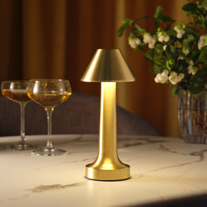 Discover the Helena Cordless Rechargeable LED Table Lamps from Tablekraft’s Ambience Collection, available in Oxide Black, Brushed Brass, and Brushed Copper, featuring a sleek design and three dimming options for optimal ambience. The conical shade design ensures ambient lighting without glare, enhancing the atmosphere of your venue with elegance and functionality. Designed in Australia and made from Aluminum and Acrylic, these lamps are charged with a Type C cable and can last up to 50 hours, with an optional 30 USB port charging station for multiple units.