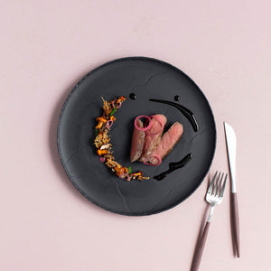 Crafted from black culinary porcelain, black vitrified porcelain has is fired at high temperatures creating dinnerware that is durable, sturdy and resistant to stains, chips and scratches. In some pieces, the extraordinary black porcelain becomes a feature for a unique and impressive appearance.