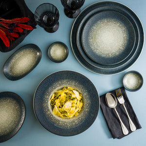 Made of clay that’s malleable and great for forming detailed shapes. Created in a two firing process where it becomes vitrified during the second firing, making porcelain an extremely durable dinnerware option that is dishwasher, microwave, and oven safe.