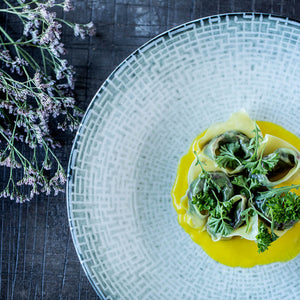 Made of clay that's malleable and great for forming detailed shapes. Created in a two firing process where it becomes vitrified during the second firing, making porcelain an extremely durable dinnerware option that is dishwasher, microwave, and oven safe.