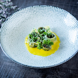 Made of clay that's malleable and great for forming detailed shapes. Created in a two firing process where it becomes vitrified during the second firing, making porcelain an extremely durable dinnerware option that is dishwasher, microwave, and oven safe.