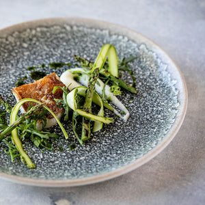 Made of clay that's malleable and great for forming detailed shapes. Created in a two firing process where it becomes vitrified during the second firing, making porcelain an extremely durable dinnerware option that is dishwasher, microwave, and oven safe.