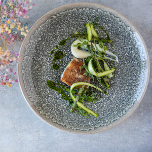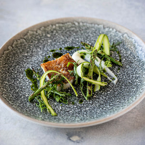 Made of clay that's malleable and great for forming detailed shapes. Created in a two firing process where it becomes vitrified during the second firing, making porcelain an extremely durable dinnerware option that is dishwasher, microwave, and oven safe.