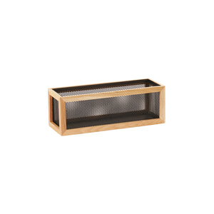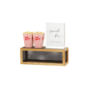 The contemporary Cal-Mil Camden collection showcases a skilfully crafted combination of black perforated metal and light oak accents, blending modern and industrial elements in an eye-catching design. The contrast between the materials adds a striking touch to any buffet service.