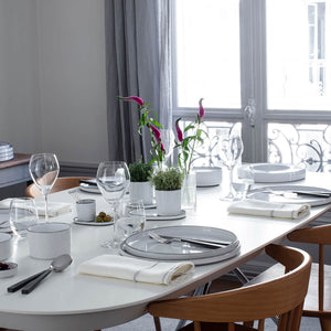 Classic and sleek, the brilliant clean base of Caractere White Cumulus adds contemporary style. The stunning charcoal rim adds contrast, while the glossy finish showcases beautifully plated dishes.