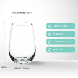 The Essentials Stemless Wine Polycarbonate 480ml provides a modern, durable alternative to traditional wine glasses. Its stemless design enhances stability while the polycarbonate construction ensures reliability in busy hospitality environments. Ideal for indoor and outdoor wine service.