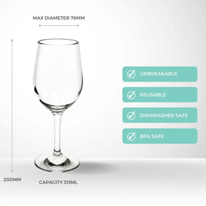 The Essentials White Wine Polycarbonate 315ml delivers controlled wine service with a classic profile and enhanced durability. Ideal for hospitality environments, it offers long-term performance, clarity, and reliability across indoor and outdoor service areas.