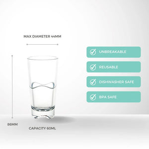 The Shot Polycarbonate 60ml is ideal for double shots, premium pours, and high-volume beverage service. Made from durable polycarbonate, it offers superior strength and safety compared to traditional glass while maintaining a clean, professional look. The larger capacity supports efficient service and consistent measurement, making it a practical choice for busy hospitality venues, event operations, and outdoor licensed areas requiring robust and reliable drinkware.