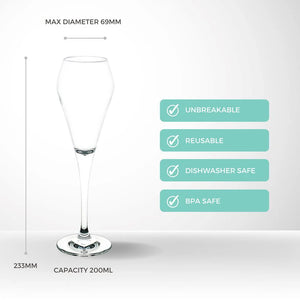The Sip Easy Prosecco Polycarbonate 200ml is designed for efficient sparkling wine and prosecco service in high-volume hospitality environments. Manufactured from premium polycarbonate, it offers excellent impact resistance and long service life while maintaining a clear, glass-like appearance. The controlled 200ml capacity supports accurate portioning and consistent presentation, making it ideal for bars, function venues, outdoor events, and licensed service areas. Lightweight and dishwasher safe, this prosecco glass is a practical solution for operations seeking durability, safety, and professional presentation.