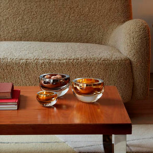 A curved, heavy glass bowl, mouth blown and hand finished by master glassblowers. The interior is painted by hand with platinum. Display as a decorative object or use as a serving bowl for nuts or olives.
