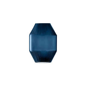 A large mouth-blown vase in cased sapphire blue glass. The angular silhouette and band of corrugated texture is inspired by the perspective, scale and repetition found in contemporary architecture.