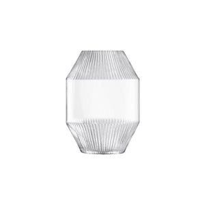 A large mouth-blown glass vase with bands of corrugated texture on the angled rim and base. Inspired by architectural detail. For branches or tall stems of flowers and foliage.