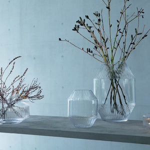 A wide mouth-blown vase with angular silhouette and band of corrugated texture. Inspired by the perspective, scale and repetition found in contemporary architecture.