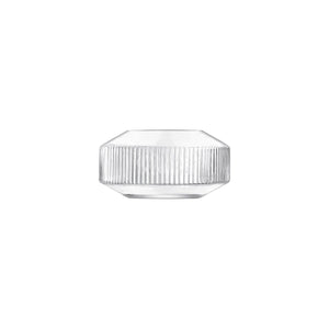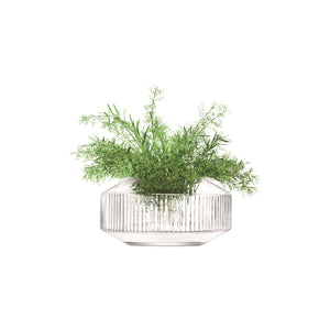 A wide, mouth-blown glass vase with low angled walls and a band of corrugated texture inspired by architectural detail. For creating low, wide arrangements of flowers and foliage or branches.