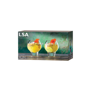 Set of two mouth-blown balloon glasses with thick conical stems and rounded bowls. Ideal for serving rum cocktails.