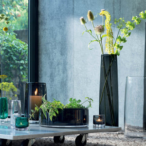 A mouth-blown bud vase with thick, sloping walls. Designed for a few short stems of flowers or foliage, or a single small flower head. Available in clear and cased-coloured glass.