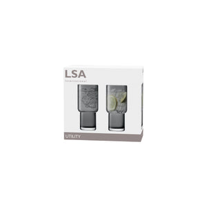 A set of two mouth-blown glass highballs with thick, stepped walls. Available in clear and cased-coloured glass.