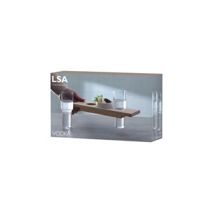 Two heavy mouth-blown vodka glasses and a porcelain dish slot into the natural ash board. Each glass has a thick, stepped base and the dish has a solid glass stem. For serving two shots of vodka alongside caviar or a small canapes.