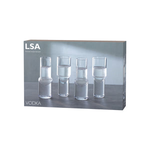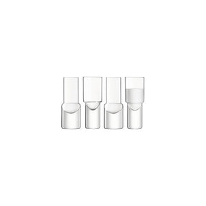 A set of two heavy-based, mouth-blown shot glasses with stepped, interlocking shapes. Inspired by the geometry of Eastern Bloc architecture and design.
