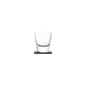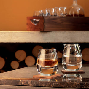 Set of two heavy based whisky glasses with a conical shape. Expert craftsmanship is required to mouth blow and finish each glass by hand. Paired with solid walnut coasters. A modern interpretation of traditional whisky drinkware.