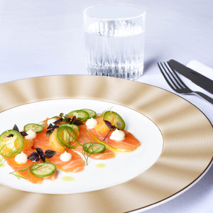 Sophisticated and luxurious, Nikko Silk Champagne is crafted on a pristine white bone china base. The elegant wide champagne coloured decoration has a beautiful silk-like texture and soft wave appearance.