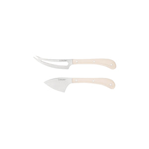 Two versatile cheese knives. The hole in the Soft Cheese Knife reduces cheese from sticking. The arched blade of the Hard Cheese Knife will cut through hard cheese with ease. The cream handle feels comfortable while adding a nostalgic look to your cheese platter.