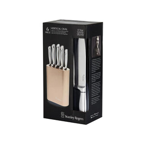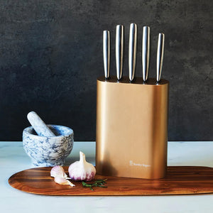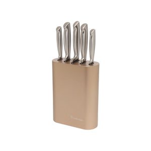 Co-ordinate with your appliances or just add a beautiful colour to your bench top with this modern metallic champagne knife block. The block houses the five essential knives to cover all cutting tasks in the kitchen.