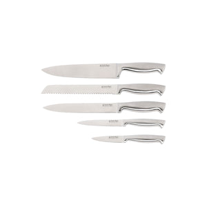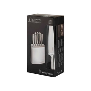 A sleek, white steel block gives a contemporary look. The block houses the five essential knives to cover all cutting tasks in the kitchen.