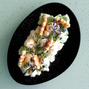 Made of clay that’s malleable and great for forming detailed shapes. Created in a two firing process where it becomes vitrified during the second firing, making porcelain an extremely durable dinnerware option that is dishwasher, microwave, and oven safe.