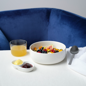 Made of clay that's malleable and great for forming detailed shapes. Created in a two firing process where it becomes vitrified during the second firing, making porcelain an extremely durable dinnerware option that is dishwasher, microwave, and oven safe.