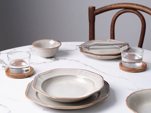 Made of clay that’s malleable and great for forming detailed shapes. Created in a two firing process where it becomes vitrified during the second firing, making porcelain an extremely durable dinnerware option that is dishwasher, microwave, and oven safe.