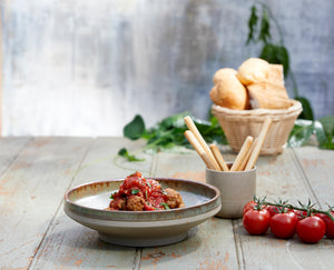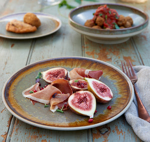 Made of clay that’s malleable and great for forming detailed shapes. Created in a two firing process where it becomes vitrified during the second firing, making porcelain an extremely durable dinnerware option that is dishwasher, microwave, and oven safe.
