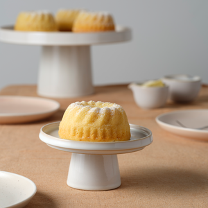 Introducing Tablekraft's presentation collection, Urban Serve. This stunning range features warm white hues, elegantly banded with subtle neutrals. The collection boasts footed stands, irregular platters, walled plates and innovative sauce solutions - perfect for impressive event buffets, bustling bakeries, chic cafes and beyond.